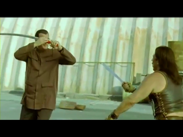隙の無い動きで、アジトのチンピラを次々とマチェーテで片付けていく。誘拐された女は、すぐに全裸で見つかったが、油断した隙に女にマチェーテを奪われ、太ももに重症を負う。