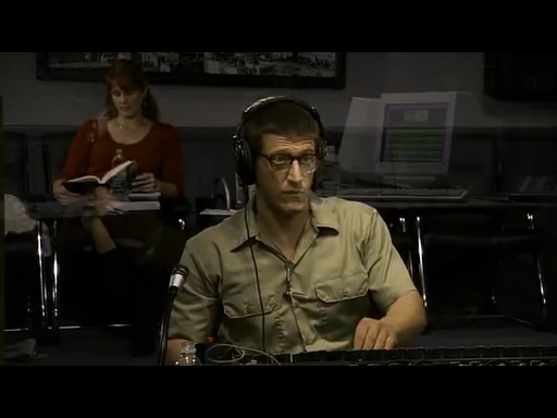 ローガンは番組の再開を決めるが、音声係のバートは様子を見て来ると席を立ってしまう。