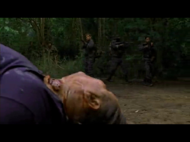 ジャングルの中にしては、モルタル造りの建物という村で、無数の噛まれた死体を発見し、奇声を上げながら襲ってくる怪人集団に襲われます。広い場所に撤退し、円陣銃撃で撃退する兵士達。しかし、銃で倒した怪人が起き上がり、ホーク隊長は木の枝に刺された死体だけが甦らないことに気づきます。何か、手頃な棒がそこら中に落ちているので、手際よく全滅できました・・・。