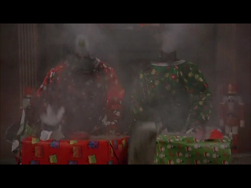 颯爽と真っ赤な帽子を脱ぎ捨てると、犬を天井へ蹴り上げ、テーブルを前転して、金満一家の主人の両手をナイフとフォークで串刺し!一睨みで気絶した女は喉を串刺し!呷った酒でキャンドルファイヤー!軟弱男は蹴り一発でKO!プディングボールで窒息死!テーブルの脚で脳天直撃!逃げる女にはツリーの星手裏剣!最後に主人の口にターキーレッグを押し込んでテーブルに叩きつけて殺戮完了!!