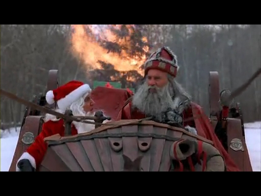 ついにサタンクロースと対峙するおじいちゃん。「ちゃんと世界中の子供達を幸せにしたか?私と約束した通り」と言うおじいちゃん。悪態を吐きながら、それに応じたサタンクロースは、ソリでおじいちゃんを轢殺。ギリギリでおじいちゃんが用意していたスノーモービルで2人は脱出するが、サタンクロースのソリは空を飛び追いかけてくる。おまけにプレゼント爆弾で空爆してくるわ、ソリにジェットエンジンは付いてるわ、で必至の追いかけっこは遂にクリスマス祭の会場へ・・・。