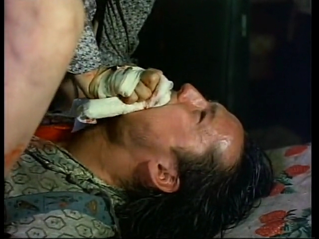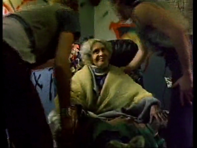 男たちに暴力を受けた女は、必死で老婆に助けを求めるが、老婆は笑顔で紐を取り出す。