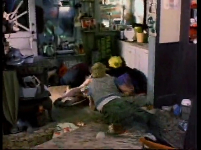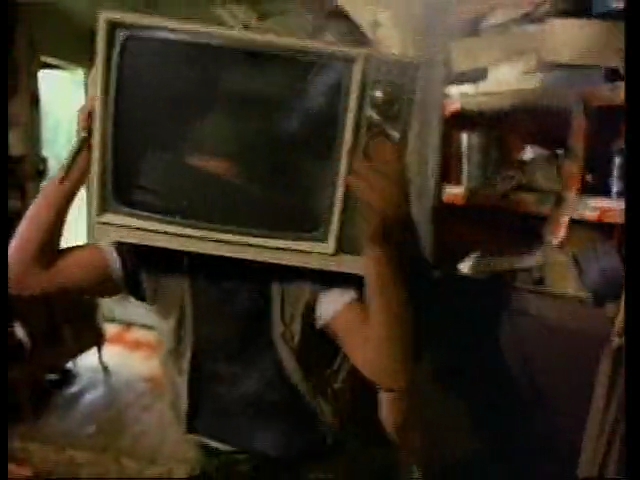 隠れていたアビーが、テレビを振り下ろすと、これがすぽっと嵌って、TVマンになったアイクは、感電しながら仰向けに倒れ血泡を吐く。