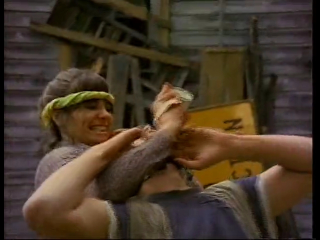 馬鹿笑いして息子を褒めながら近づくと(孔明<今です)、背後からトリナが飛び掛り、もちろん演技なのでアビーも押さえ込みに入る。