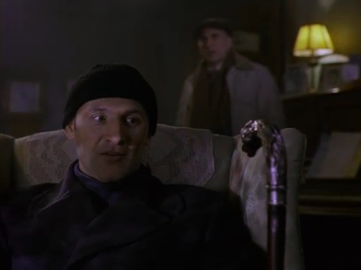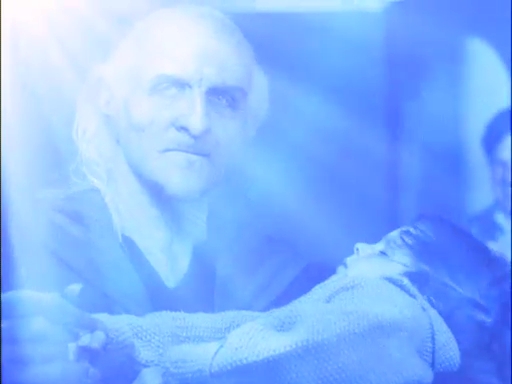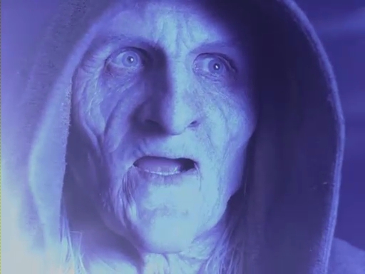 男は「欲ある者よ土に還れ、罪ある者よ来るがいい」と言うと、マーサの歩行イスを跳ね飛ばし、その頭に狼の飾りが付いた杖を振り下ろす。